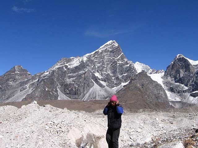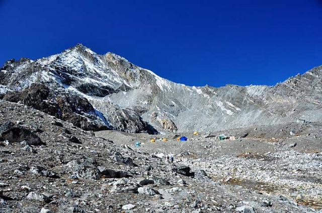 The base camp of Pokalde Peak is situated in a raised "amphitheatre" style valley with a large circular lake in the middle below the Kongma La pass. About 40 minutes from the base camp is the Kongma glacier. This glacier offers ice walls suitable for ice climbing training by appropriately equipped and motivated groups. The glacier is said to be receding in size.
