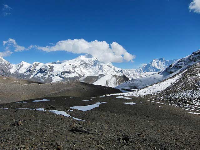 There is ontroversy regarding the name and location of the Chulu peaks. There are several peaks forming part of Chulu massif but these are not always indicated on maps. It is therefore sometimes difficult to differentiate between the two trekking Chulus (East and West) as the group comprises of four peaks, two to the east and two to the west. To add further confusion, Chulu West may also be called Chulu Central. Chulu West lies to the north of Annapurna above the Manang Valley and is the highest of the peaks. It was first climbed in 1952 by a Japanese Expedition. The Base Camp for the climb is situated in a small valley north of Manang, off the main trail to the Thorang La. At Chauri Lather we take a narrow, steep trail up to a Base Camp at 4800m. From there we climb steep, rocky ground to a high camp at about 5300m. There is no technical difficulty involved in reaching the summit, but progress can be slow as the slopes are vulnerable to avalanches in certain conditions. Ascent of Chulu West and Chulu Central are best made from a base camp in a small valley north of Manang situated off the main trail to Thorong La pass 5416m. Indeed some of the best views of this peak can be had from that pass.